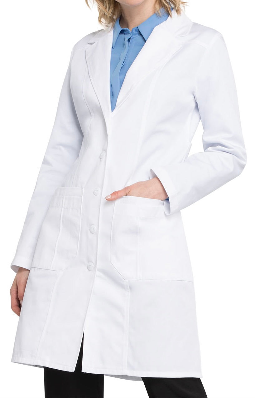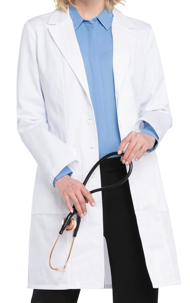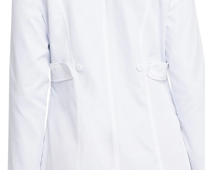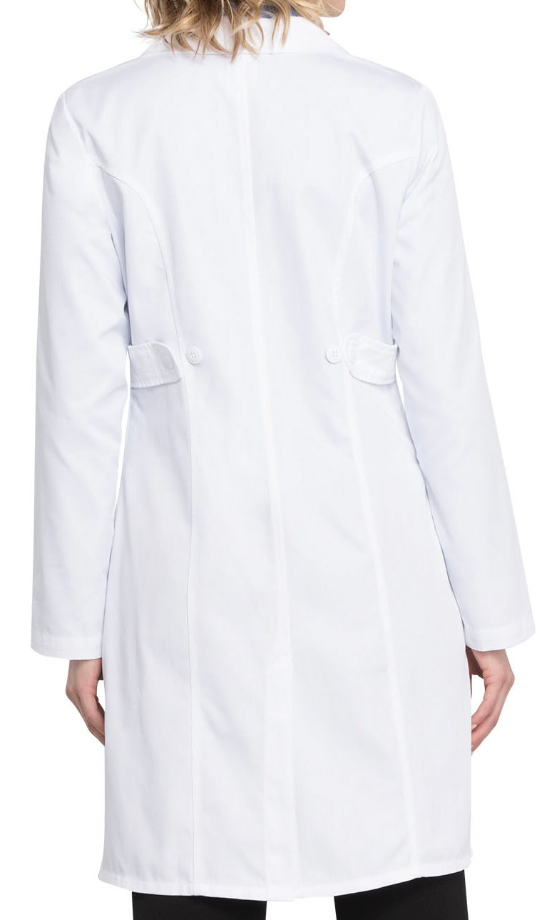 Classic fit lab coat features a notched lapel, front yokes & back princess seams, two roomy double patch pockets with stitched down instrument holders. Back adjustable buttons.