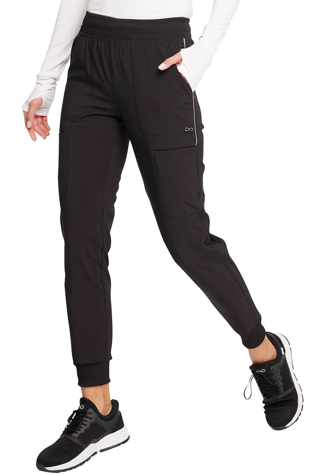 Pull-on jogger has a rib-knit waistband with interior elastic and drawstring. The jogger leg is finished with rib-knit cuffs.