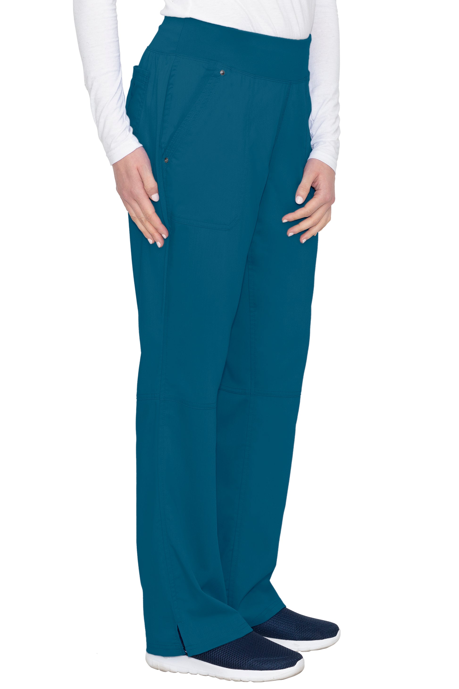 A wide knit waistband adds extra comfort to the Women's Tori Yoga Scrub Pant from Purple Label by Healing Hands. In a luxurious stretch fabric, this 5-pocket scrub pant keeps up with you, shift after shift.